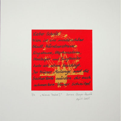 Siebdruck: Gold auf Rot mit Schrift in Schokobraun